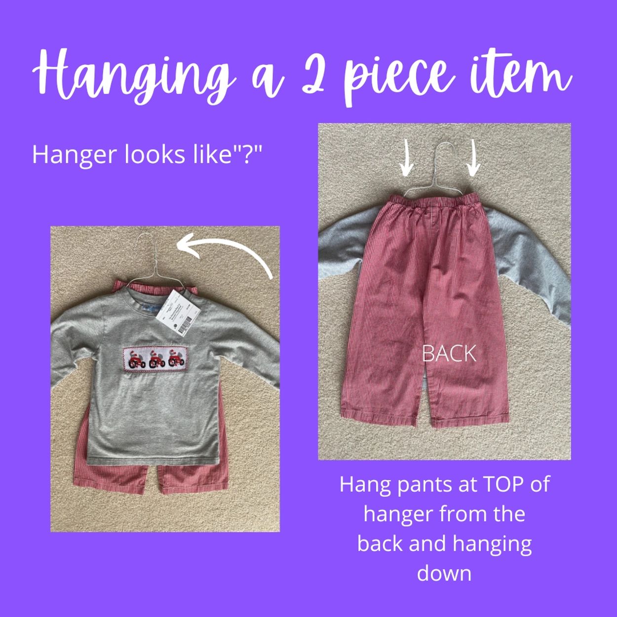 PLEASE PIN AT THE TOP OF THE HANGER FOR PANTS.